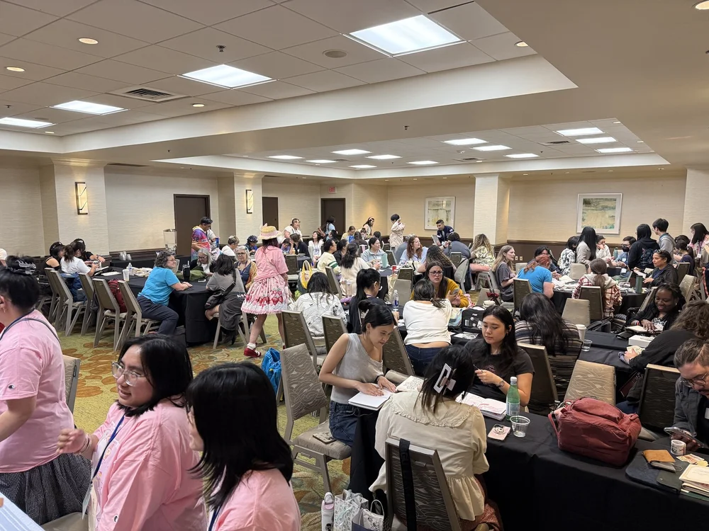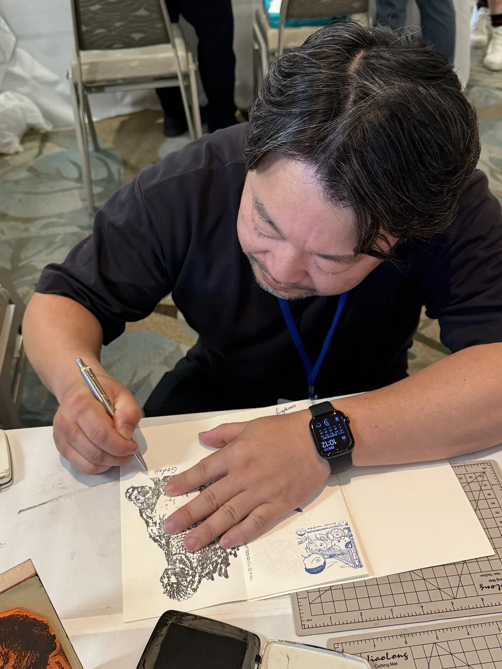 Pink-shirted folks were on hand to help facilitate the Sakura Dragon meetup, where folks got a chance to mingle with other fans, swap and share from the destash table, stamp to their hearts’ content, and work on their journals. No surprise this was such a popular meetup!
