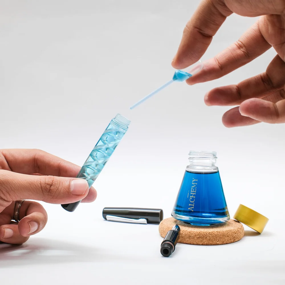 Each MAZE pattern (Five of them!) feels like its own personality carved into light. You can run it as a classic eyedropper or go full engineering-nerd with the Japanese eyedropper shut-off system for leak-proof travel. And yes: shimmering inks look beautiful in these barrels — in the best way possible.